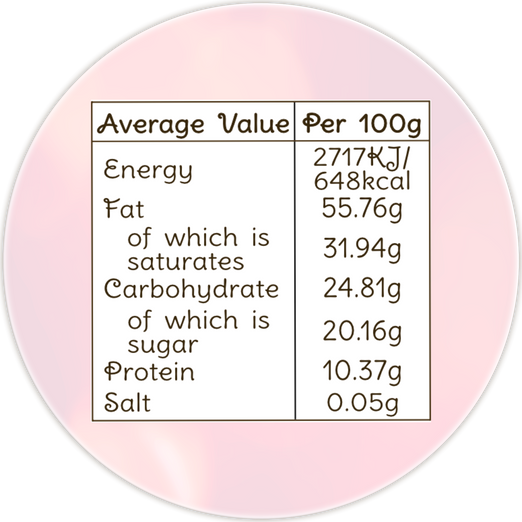 Made in a kitchen that also handles: nuts, peanuts, gluten, sesame, celery, mustard & soya.