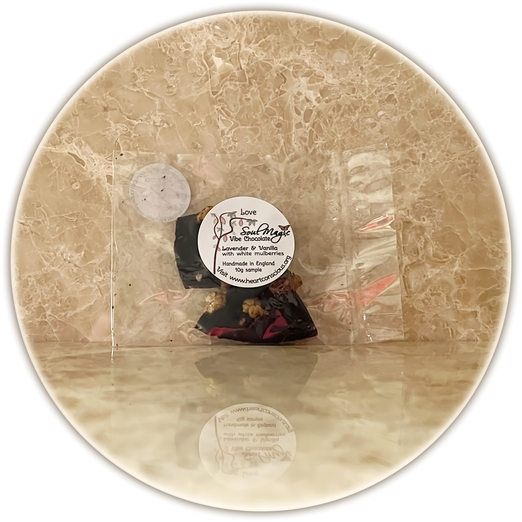 Handmade rich, dark chocolate with warm, comforting vanilla, a hint of light, floral, lavender and sweet, chewy white mulberries and a Love vibe.